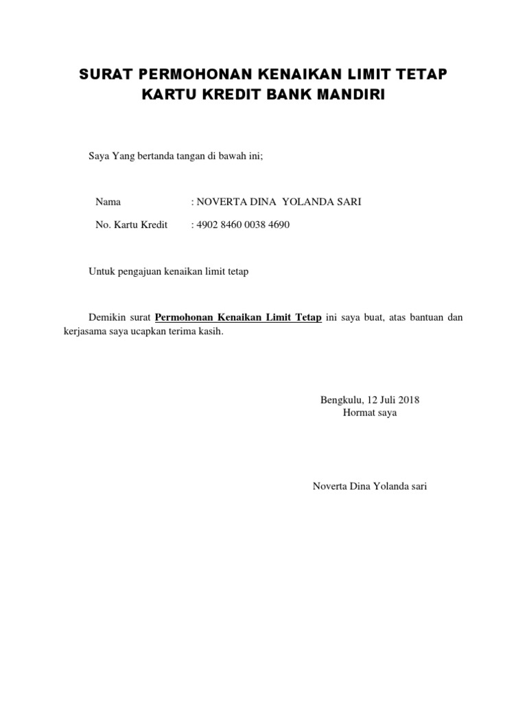 Buat surat permohonan yang berisi permintaan kenaikan limit kartu kredit BNI. Tuliskan nama lengkap Anda, nomor kartu kredit, serta limit yang Anda inginkan. Jangan lupa untuk menyebutkan alasan mengapa Anda membutuhkan kenaikan limit kartu kredit.